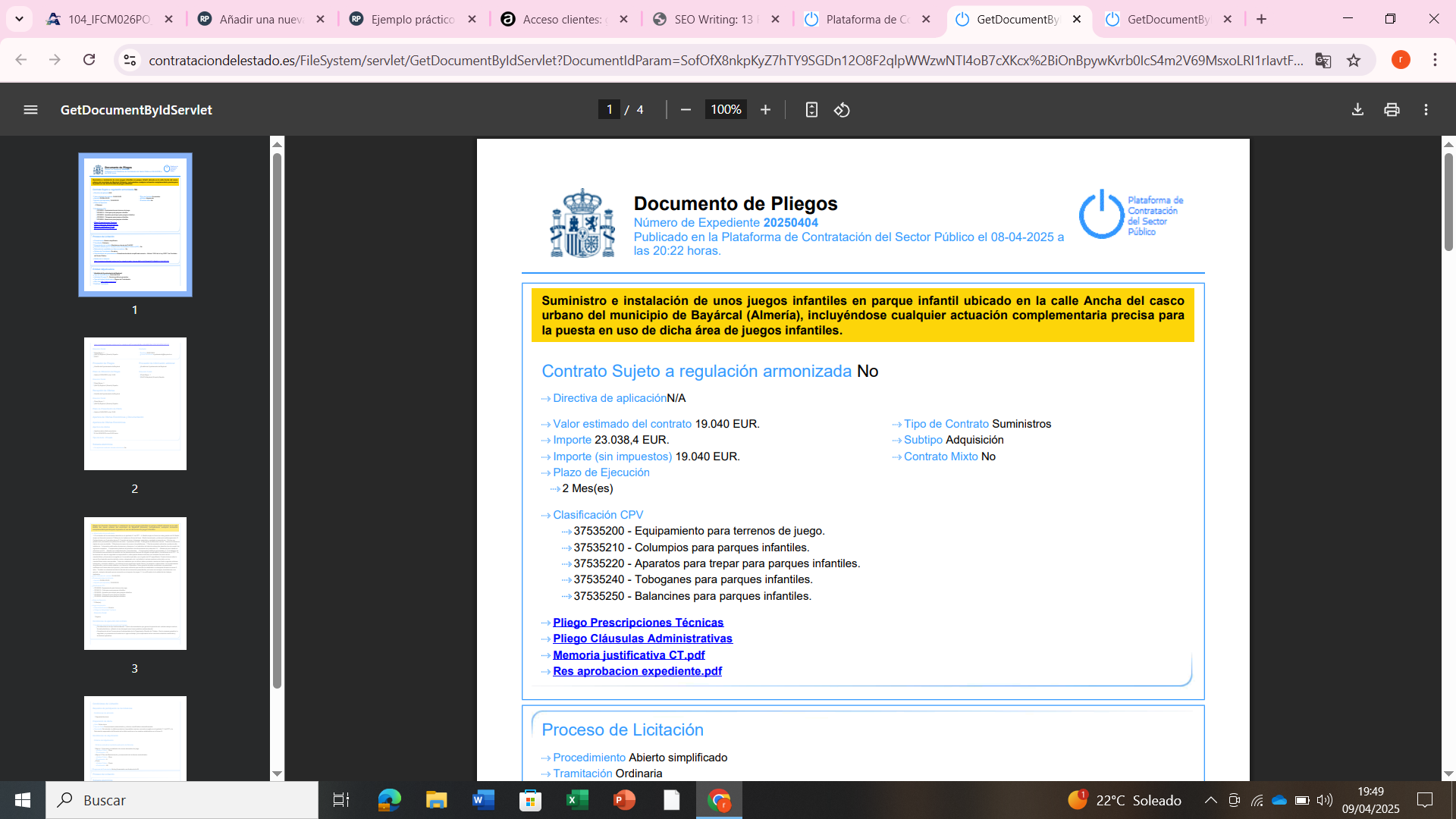Todos estos datos, en principio, son suficientes para que podamos tomar la decisión de presentarnos, o no, a la licitación. Tanto en el caso de presentarnos como si aún tenemos alguna duda tenemos que ir a los pliegos, pinchar en Pdf y pinchar los enlaces «Pliego Cláusulas Administrativas» y «Pliego Prescripciones Técnicas».